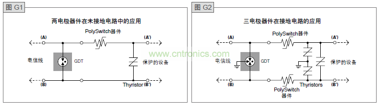 失效保護(hù)機(jī)構(gòu)是安裝在位于氣體放電管中心電極焊塊上的短路簧片。如圖G12所示,在正常的工作條件下,焊塊使得彈簧片浮在外側(cè)電極之上。當(dāng)長(zhǎng)時(shí)間放電使氣體放電管溫度達(dá)到焊塊的熔點(diǎn)時(shí),焊塊就會(huì)被軟化,促使短路彈片被激活,并與兩個(gè)外側(cè)電極搭接。這個(gè)過(guò)程導(dǎo)致三個(gè)電極之間永久短路,建立起一條低阻抗路徑,將故障電流引到地面,而不會(huì)產(chǎn)生顯著的熱量。