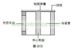 失效保護(hù)機(jī)構(gòu)是焊接在中心電極上帶塑料薄片的短路簧片。在正常的工作條件下,塑料薄片與兩個(gè)外側(cè)電極隔離,如圖G13。當(dāng)長(zhǎng)時(shí)間放電使氣體放電管溫度達(dá)到塑料薄片的熔點(diǎn)時(shí),塑料薄片就會(huì)被軟化,促使短路彈片被激活,并與兩個(gè)外側(cè)電極搭接。這個(gè)過(guò)程導(dǎo)致三個(gè)電極之間永久短路,建立起一條低阻抗路徑,將故障電流引到地面,而不會(huì)產(chǎn)生顯著的熱量。