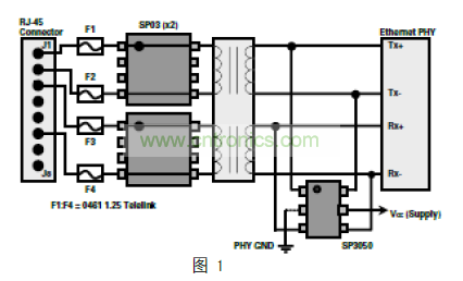 任何線路端保護(hù)裝置(這個(gè)例子中的 SP03A)不能有 GND引腳(2、3、6 和 7)連接到 GND,以保證符合 IEEE802.3隔離標(biāo)準(zhǔn);因此,設(shè)計(jì)師沒有選擇,只能將此設(shè)備作為“異模”保護(hù)器。(注:當(dāng)然,這使得驅(qū)動(dòng)端保護(hù)元件成為必要,以保護(hù)系統(tǒng)免受共模事件損壞。)
