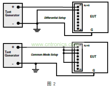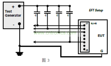 檢查設(shè)備的 EFT 免疫力(根據(jù) IEC61000-4-4 標(biāo)準(zhǔn)),與共模雷擊浪涌測(cè)試非常相似。在如圖 3 所示比較典型的配置中,所有的導(dǎo)體(或引腳)電容耦合到測(cè)試信號(hào)發(fā)生器的正極和“浪涌”到 GND。如果數(shù)據(jù)線幾乎沒有差別,線對(duì)之間很少有異模能量,但變壓器耦合電容會(huì)再次將共模能量以衰減的方式傳輸?shù)津?qū)動(dòng)端。