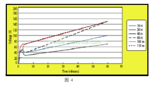 隨之而來(lái)的高能量放電可能會(huì)損壞連接器,變壓器電路,或以太網(wǎng)收發(fā)器。雙絞線電纜表現(xiàn)像一個(gè)存儲(chǔ)電荷的電容器。有研究證明,未連接到終端的雙絞線電纜可能會(huì)積累幾百伏的電荷。此外,在一個(gè)小時(shí)內(nèi),完全放電的電纜可以積累其所能積累總電荷的一半。一旦有了靜電,高品質(zhì)的電纜保留其所帶靜電的時(shí)間可以超過 24 小時(shí)。下面圖 4展示了不同長(zhǎng)度的 CAT5 電纜積累靜電如何隨著時(shí)間而變化。由于較長(zhǎng)的電纜有容量來(lái)存儲(chǔ)更多的電荷,電纜長(zhǎng)度超過 60m 的系統(tǒng)應(yīng)采取額外的 CDE 預(yù)防措施。