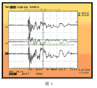 另一個(gè)要了解的重要因素是 CDE 波形,因?yàn)樗幌褚郧坝懻摰娜魏瓮{,取決于耦合機(jī)制,要么是異模,要么是共模。此外,初步研究顯示,它在特點(diǎn)上有很大差異,但總體上看,CDE 的波形能量高,體現(xiàn)在電壓和電流驅(qū)動(dòng)上。波形傳播的時(shí)間為幾百納秒,能夠快速反轉(zhuǎn)極性。下面的圖 5,給出了破壞性 CDE 波形的例子,在一個(gè)以太網(wǎng) PHY 發(fā)射器引腳,一個(gè) 25 英尺雙絞線電纜靜電電壓達(dá) 1.5KV。在該事件發(fā)生超過 600ns 時(shí)間的期間,在異模波形上看到有 64.8V 從正電壓轉(zhuǎn)換為負(fù)電壓。在這個(gè)實(shí)驗(yàn)中,PHY 的發(fā)射器被破壞,無(wú)法在網(wǎng)絡(luò)上傳輸數(shù)據(jù)包。