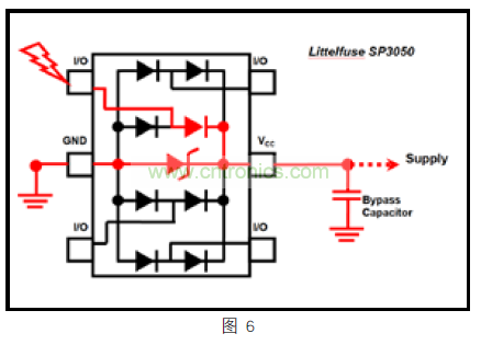 通過連接 SP3050的 VCC 引腳,由于電氣瞬態(tài)兩個(gè)獨(dú)立的放電路徑,如下(圖 6)紅色所示,設(shè)計(jì)者將更好進(jìn)行夾緊設(shè)計(jì)。可以簡(jiǎn)單地將它看作一個(gè)電阻分壓器,其中瞬態(tài)電流通過導(dǎo)向二極管,并選擇了兩條路,一個(gè)通過內(nèi)部 TVS到 GND,一個(gè)通過電源或外部旁路電容到 GND??偠灾?5 腳連接到電源,將導(dǎo)致更好的夾緊性能,給以太網(wǎng) PHY 提供更好的整體保護(hù)。