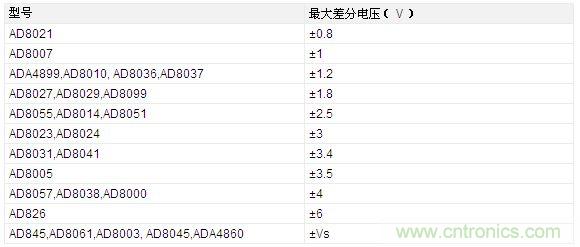 表1 所選高速運(yùn)算放大器的最大差分電壓額定值