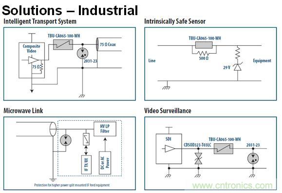 工業(yè)應(yīng)用包含單線或雙線的保護(hù),同樣非常簡單,TBU加一個(gè)氣體管,再加一個(gè)非常小的TBS。在這里加上TBU管有什么好處呢?因?yàn)門BS反應(yīng)速度非??欤梢院芸旆磻?yīng),TBU很快就會(huì)打通,在打通之后,打開之后所有的線路的過流和高壓都會(huì)阻絕在外面。