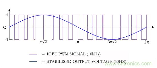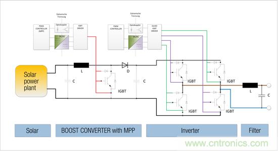 圖1:帶助推器和逆變器(頂部)的太陽能發(fā)電廠功能圖。每個IGBT驅(qū)動器都有一個良好的帶隔離的DC/DC轉(zhuǎn)換器供電。設備通過一個高頻PWM信號控制,這個信號輸出平滑的正弦波(左)。