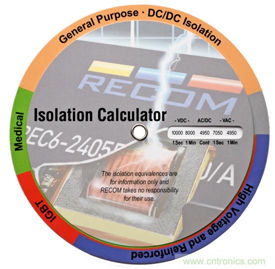 在某些規(guī)格書中,隔離電壓的測試時間有可能是1秒鐘或者1分鐘甚至是一個連續(xù)的長時間。測試加載時間越長,其測試電壓就會越低。為了使用戶能夠準確地確定這個關(guān)鍵值,RECOM提供一個CD光盤尺寸大少的免費ISO計算工具。一個隔離電壓時間規(guī)格的轉(zhuǎn)換器。只要發(fā)送郵件到info@recom-electronic.com 即可免費索取ISO計算器。另外,在網(wǎng)站www.recom-electronic.com上也可以找到這個在線工具。