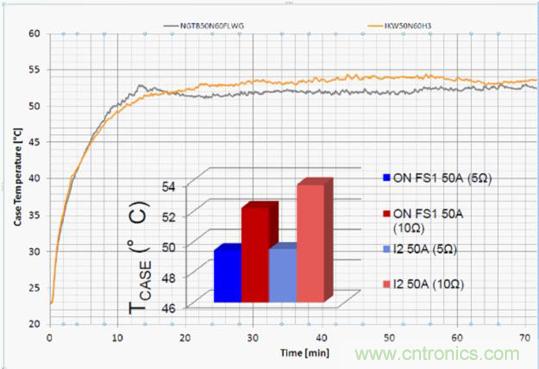 安森美半導(dǎo)體的客戶已成功使用其場(chǎng)截止型第一代IGBTNGTB50N60FLWG開(kāi)發(fā)出了各種應(yīng)用,如功率10 千伏安、功率因數(shù)0.9的不間斷電源,以及采用半橋諧振拓?fù)浣Y(jié)構(gòu)的1450瓦廚用電爐??蛻粽J(rèn)為,安森美半導(dǎo)體場(chǎng)截止型第一代IGBT的性能達(dá)到了市場(chǎng)上最好的性能;其IGBT在電磁爐上的溫升低于其它2款I(lǐng)GBT。