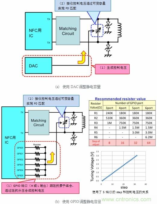 第二, 如圖2(b)所示,從NFC用IC等GPIO端口生成控制電壓來(lái)調(diào)整靜電容量。GPIO是General Purpose Input/Output的簡(jiǎn)稱,是IC芯片提供的輸出端子的一種。特定用途和信號(hào)尚未明確,但可以根據(jù)軟件指令進(jìn)行任意的輸出變化。比如說(shuō),軟件指示為輸入“0”的話則為0V,指示為輸入“1”的話則有可能會(huì)執(zhí)行輸出3V的操作。如果利用GPIO的輸出端子的話,如果收到的是0V、3V這兩個(gè)值的輸出信號(hào),那么執(zhí)行的操作就是通過(guò)2n的電子元件的組合來(lái)實(shí)現(xiàn)合成2n的阻抗電壓。