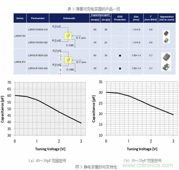 薄膜可變電容器的產(chǎn)品陣容如表1所示。1.3×0.9mm尺寸的LXRW19V系列、1.95×1.4mm尺寸的LXRWJFV系列已經(jīng)產(chǎn)品化。