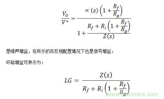 這對(duì)于理想的CFB[Ri=0]來(lái)說(shuō),是一個(gè)非常重要的公式,因?yàn)樗砻髁谁h(huán)路增益與反饋電阻的比例關(guān)系,因此反饋電阻可作為CFB的主要補(bǔ)償。事實(shí)上,增加反饋電阻及帶寬(BW),不僅會(huì)降低反饋電阻,同時(shí)還可增大帶寬。實(shí)際上,不可能將反饋電阻降低到特定值以下,否則放大器會(huì)發(fā)生振蕩。