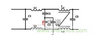 EMI濾波技術(shù)是一種抑制尖脈沖干擾的有效措施,可以濾除多種原因產(chǎn)生的傳導(dǎo)干擾。圖3是一種由電容、電感組成的EMI濾波器,接在開關(guān)電源的輸入端。電路中,C1、C5是高頻旁路電容, 用于濾除兩輸入電源線間的差模干擾;L1與C2、C4;L2與C3、C4組成共模干擾濾波環(huán)節(jié),用于濾除電源線與地之間非對稱的共模干擾;L3、L4的初次級匝數(shù)相等、極性相反,交流電流在磁芯中產(chǎn)生的磁通相反,因而可有效地抑制共模干擾。測試表明,只要適當選擇元器件的參數(shù),便可較好地抑制開關(guān)電源產(chǎn)生的傳導(dǎo)干擾。