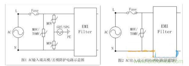 在交流電源AC輸入端浪涌保護(hù)方案,可以采用壓敏電阻(MOV) 或加氣體放電管(GDT/SPG)組合來進(jìn)行設(shè)計(jì)。在有接地的情況下,可以采用如圖1差共模同時防護(hù)的理念,在L-N之間并聯(lián)壓敏電阻(MOV),可以有效地抑制差模所產(chǎn)生的浪涌過電壓,起到對后級電路保護(hù),在L/N-PE之間分別采用MOV 或MOV+GDT/SPG對地的電路連接方式可以有效的將共模浪涌能量泄放到大地, 防止浪涌引入到后級電路而造成損壞;如果在電源沒有接地線情況下,如圖2則在L-N線間可直接并聯(lián)壓敏電阻進(jìn)行差模防護(hù)即可。為了避勉MOV保護(hù)元件在防護(hù)失效之后,出現(xiàn)短路失效著火燃燒的可能性,可以使用TMOV或PMOV進(jìn)行保護(hù)。針對上面 MOV交流耐受電壓選擇至少要高于線路最大交流工作電壓1.2~1.4倍,以避勉誤動作,在有同時使用放電管GDT/SPG時,放電管擊穿電壓的下限值必須至少高于電路的最大峰值電壓,耐受電流必須根據(jù)自身浪涌等級的需求選擇不同電流等級,以符合于浪涌測試標(biāo)準(zhǔn)的要求。