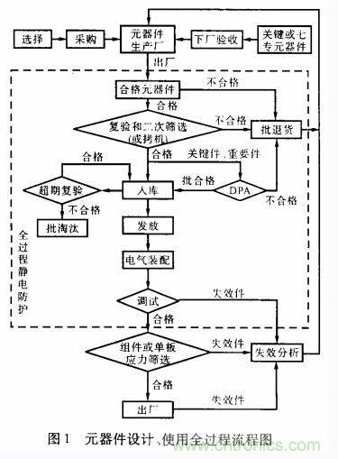 元器件使用全過(guò)程包括選擇、采購(gòu)、監(jiān)制、驗(yàn)收、篩選(拷機(jī))、破壞性物理分析(DPA)、保管、使用、電氣裝配、通電調(diào)試、靜電防護(hù)和失效分析等。元器件的選擇和使用全過(guò)程流程圖如圖1所示。
