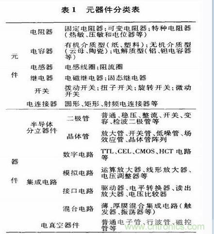 顧名思義,元器件可分為元件和器件2大類(lèi)。元件中有電阻、電容、電感、繼電器和開(kāi)關(guān)等;器件可分為半導(dǎo)體分立器件、集成電路以及電真空器件等。表1為元器件分類(lèi)表。