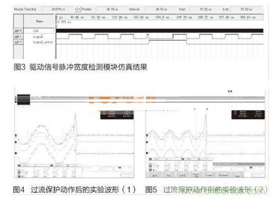 針對(duì)前文設(shè)計(jì)的驅(qū)動(dòng)信號(hào)脈沖寬度檢測(cè)電路,通過仿真進(jìn)行功能驗(yàn)證,仿真結(jié)果如圖3所示,當(dāng)驅(qū)動(dòng)信號(hào)(signal)脈沖過窄時(shí),檢測(cè)模塊輸出高電平(signal_error)信號(hào),意味著驅(qū)動(dòng)信號(hào)的高電平信號(hào)脈寬小于預(yù)先設(shè)定的脈寬門限值上限,輸出高電平報(bào)警。