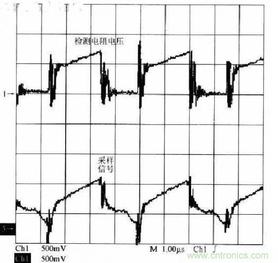 圖4給出了UC3842檢測電阻的電壓波形和采樣信號波形。從圖4中可以看出,經(jīng)過改進后的電路,其采樣信號的波形緊緊跟隨檢測電阻的電壓波形,沒有出現(xiàn)非常大的尖峰電壓。因此,該電路能有效避免因變壓器漏感等異常干擾引起的電源誤操作的問題,也能有效避免因電源占空比過大而引起的系統(tǒng)不穩(wěn)定的問題。