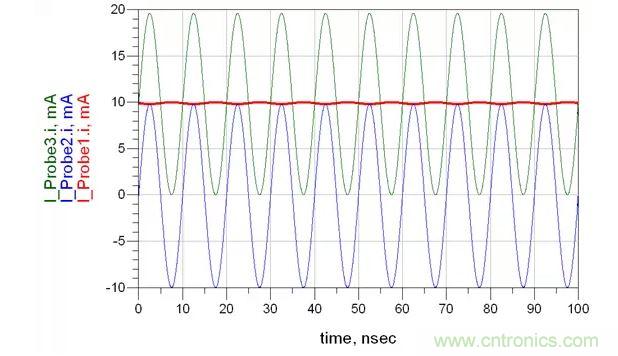 環(huán)路2由一個(gè)100MHz的AC1.0V供電,表示我們的干擾源,電流表2測量路徑2上的電流。