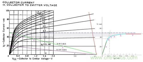 圖中假定電源電壓為4V,綠色的斜線是負載電阻為80歐姆的負載線,V/R=50MA,圖中標出了Ib分別等于0.1、0.2、0.3、0.4、0.6、1.0mA的工作點A、B、C、D、E、F。據此在右側作出了Ic與Ib的關系曲線。根據這個曲線,就比較清楚地看出“飽和”的含義了。曲線的綠色段是線性放大區(qū),Ic隨Ib的增大幾乎成線性地快速上升,可以看出β值約為200。蘭色段開始變彎曲,斜率逐漸變小。紅色段就幾乎變成水平了,這就是“飽和”。實際上,飽和是一個漸變的過程,蘭色段也可以認為是初始進入飽和的區(qū)段。在實際工作中,常用Ib*β=V/R作為判斷臨界飽和的條件。在圖中就是假想綠色段繼續(xù)向上延伸,與Ic=50MA的水平線相交,交點對應的Ib值就是臨界飽和的Ib值。圖中可見該值約為0.25mA。