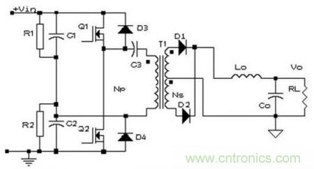 電容器C1和C2與開關(guān)管Q1、Q2組成橋,橋的對角線接變壓器T1的原邊繞組,故稱半橋變換器。如果此時(shí)C1=C2,那么當(dāng)某一開關(guān)管導(dǎo)通時(shí),繞組上的電壓只有電源電壓的一半。