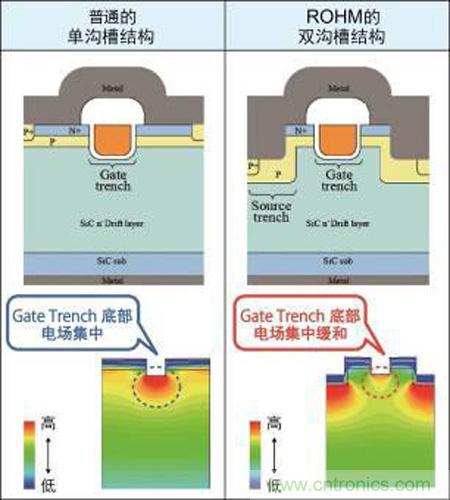 溝槽結(jié)構(gòu)因在SiC-MOSFET中采用,可有效降低導(dǎo)通電阻而備受關(guān)注。但為了確保元器件的長期可靠性,需要設(shè)計能夠緩和Gate Trench部分(通過有無施加電壓來控制MOSFET元件的開關(guān)ON/OFF的部位)產(chǎn)生的電場的結(jié)構(gòu)。因為當僅在Gate Trench部位采用溝槽結(jié)構(gòu)時,Gate Trench結(jié)構(gòu)底部電場集中,很難確保元器件的可靠性。ROHM通過采用獨創(chuàng)的結(jié)構(gòu),緩和了Gate Trench結(jié)構(gòu)底部的電場集中現(xiàn)象,從而成功實現(xiàn)了采用溝槽結(jié)構(gòu)的SiC-MOSFET的量產(chǎn)(圖6)。