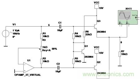 從仿真結(jié)果可以看出輸出的波形比輸入波形稍往上有個偏移。這是由于 Q1 將Q2 和 Q3 的基極電位抬高使得 Q2和Q3處于微微開啟狀態(tài),也就是當(dāng)輸入信號為0時,輸出也是稍有些電壓的。不過這個偏移很小,只有幾十mV。對大多數(shù)的應(yīng)用來說沒有太大的影響。如果對此很在意,可以適當(dāng)?shù)募哟驲6的阻值,R6增大,Q1的基極電流降級, 發(fā)射結(jié)壓降降低,Q2、Q3的基極靜態(tài)工作點(diǎn)同樣也會降低。