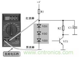 檢測(cè)這一電路中的3只二極管最為有效的方法是測(cè)量二極管上的直流電壓,如圖9-41所示是測(cè)量時(shí)接線示意圖。如果測(cè)量直流電壓結(jié)果是1.8V左右,說明3只二極管工作正常;如果測(cè)量直流電壓結(jié)果是0V,要測(cè)量直流工作電壓+V是否正常和電阻R1是否開路,與3只二極管無關(guān),因?yàn)?只二極管同時(shí)擊穿的可能性較小;如果測(cè)量直流電壓結(jié)果大于1.8V,檢查3只二極管中有一只開路故障。