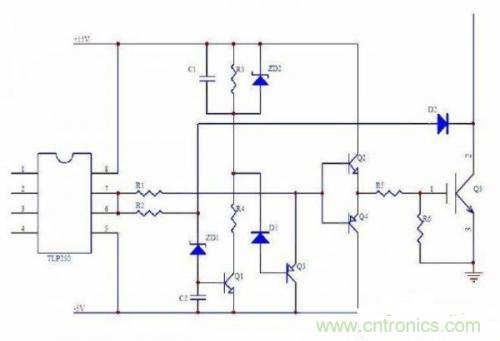 所以IGBT的短路保護(hù)一般是配合過載保護(hù)的,下面是一個(gè)TLP250增加慢降柵壓的驅(qū)動(dòng)和短路保護(hù)的應(yīng)用電路圖: