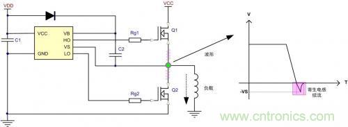 上圖為典型的半橋自舉驅(qū)動電路,由于寄生電感的存在,在高端MOS關閉后,低端MOS的體二極管鉗位之前,寄生電感通過低端二極管進行續(xù)流,導致VS端產(chǎn)生負壓,且負壓的大小與寄生電感與成正比關系。該負壓會把驅(qū)動的電位拉到負電位,導致驅(qū)動電路異常,還可能讓自舉電容過充電導致驅(qū)動電路或者柵極損壞。由于IC的驅(qū)動端通常都有寄生二極管,當瞬間的大電流流過驅(qū)動口的二極管時,很可能引發(fā)寄生SCR閉鎖效應,導致驅(qū)動電路徹底損壞。