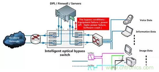 OBP旁路保護(hù)系統(tǒng): 光旁路保護(hù)系統(tǒng)(Optical Bypass Protection system)是一種應(yīng)用于光纖通信領(lǐng)域并能自動繞過故障網(wǎng)絡(luò)節(jié)點(diǎn)的智能光路切換系統(tǒng),能自動識別網(wǎng)絡(luò)節(jié)點(diǎn)供電狀態(tài)及光信號輸出狀態(tài),當(dāng)本地光設(shè)備出現(xiàn)故障(包括電源中斷、硬件或軟件故障等)后,能夠瞬間切換到旁通光路,通訊線路將繞過本地設(shè)備(即故障節(jié)點(diǎn)),從而能避免由于該故障節(jié)點(diǎn)而發(fā)生全阻障礙,保證系統(tǒng)連通正常。