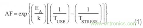 JEDEC和AEC標(biāo)準(zhǔn)均基于健全完善的基本原理,不過技術(shù)上比較落后。雖然通過硅產(chǎn)品質(zhì)量鑒定是一件有價(jià)值的、里程碑式的重大事件,但是用戶需要一個能夠在實(shí)際使用條件下,在所需的使用壽命內(nèi),比如說10年,以低故障率持續(xù)運(yùn)行的產(chǎn)品。因此,推出FRAM、成比例CMOS、GaN等新技術(shù)的公司需要了解這些標(biāo)準(zhǔn)的基本原理。在JEDEC質(zhì)量鑒定方法體系中,主要的促進(jìn)要素是溫度。根據(jù)方程式eq.(1)計(jì)算出加速因子 (AF),在這里EA是激活能量,而k是玻爾茲曼常數(shù)。