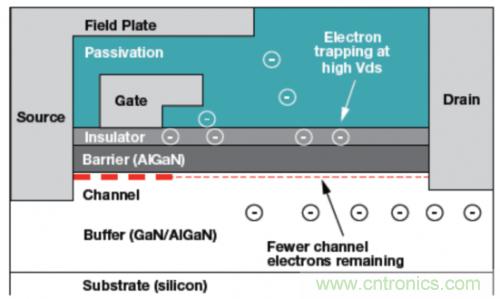 圖1:一個GaN器件的電路橫截面顯示被陷獲的電子如何通過減少通道層中的電子數(shù)量來增加Rds導(dǎo)通電阻。