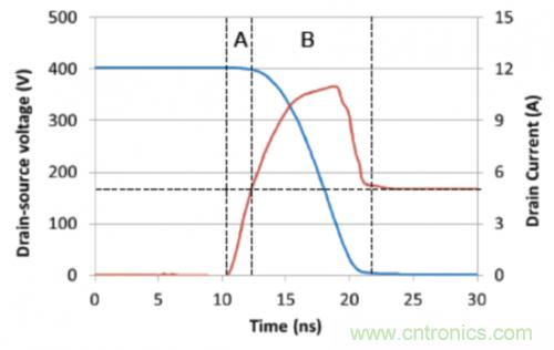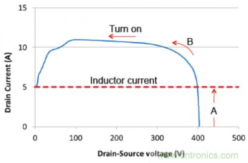器件應(yīng)力由使用圖2中所示拓?fù)涞纳龎恨D(zhuǎn)換器顯示。圖3中顯示的是初級側(cè)開關(guān) (FET1) 上硬開關(guān)接通變換的仿真結(jié)果。輸入電壓為200V,而電感器電流為5A(負(fù)載電流大約為2.5A)。在這個情況下,當(dāng)FET1關(guān)閉時(shí),由于鉗制FET (FET2) 導(dǎo)電,它的漏電壓大約鉗制在400V。因此,當(dāng)FET1接通時(shí),它需要在Vds開始下降之前灌入整個電感器電流(區(qū)域A)。