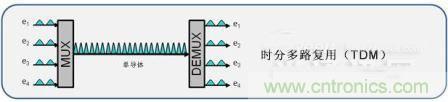 時分復(fù)用是一種通過使用越來越小的時間增量來傳輸更多的數(shù)據(jù)的方式,并且將較低數(shù)據(jù)率的信號復(fù)用進(jìn)較高速度的復(fù)合信號中。通過時分復(fù)用,較低速度的電信號交錯在時間中,并在較快的復(fù)合光路上傳輸。因此,所得的較高數(shù)據(jù)速率將是單個輸入速率的數(shù)倍。