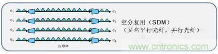 空分復(fù)用,通常被稱為并行光纖,是一種通過在復(fù)合鏈路中增加一條或多條光纖來增加一個或多個通道的方式。在這種情況下,一個通道實際上就是另一股光纖。這是上述時分復(fù)用通道的一個替代方案,在時分復(fù)用中,信號以按時間合并在同一條光纖上。行業(yè)中有很多應(yīng)用這種技術(shù)的例子。例如,40G SR4通過使用四通道或光纖,在多模光纖上提供40Gbps的速率。也就是在每個方向上有四個通道。這也正是“SR4”中4的含義,4個通道,每個10Gbps。