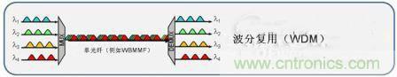 波分復(fù)用是通過由不同光的波長(顏色)隔離而成的多個通道上,經(jīng)復(fù)用器匯合和分離而同時發(fā)送信號的技術(shù)。顧名思義,用于傳輸?shù)牟ㄩL頻帶被分為多段,每段都能用作通信的信道。將多個信道擠出來作為一個小頻譜是可能的。用于長途、單模系統(tǒng)的常見版本叫做密集波分復(fù)用或粗波分復(fù)用。在多模系統(tǒng)中,短波分復(fù)用技術(shù)正在出現(xiàn)。