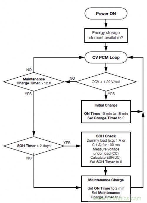 當充電量超過標稱電量的5%時就需要初次充電。圖4流程圖中的5-15分鐘“ON時間”是恒壓充電的典型時間范圍,具體取決于應用的電能需求。初次充電可使混合電容器足以滿足下次使用的要求。如果所需電能顯著少于規(guī)定的每電芯115 J(例如90 F電芯),則可減少“ON時間”。在后備使用之后或在系統(tǒng)停電幾天或幾星期之后很可能需要初次充電。