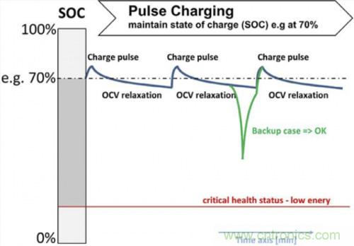 圖5.典型的維護充電 – 充電脈沖使荷電狀態(tài)處于定義的高水平。OVC 休息取決于荷載情況和自放電。對于典型的后備應用,荷電狀態(tài)必須高到足以滿足電能需求。