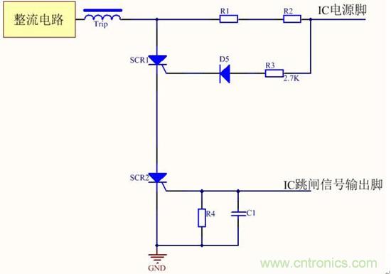 斷路器三相同時(shí)通電時(shí),經(jīng)過全橋整流之后加在可控硅兩端的直流電壓超過500V,對(duì)單個(gè)可控硅的參數(shù)要求非常高,目前主流產(chǎn)品都是采用雙硅串聯(lián)的電路,以此降低單個(gè)可控硅兩端的直流電壓,提高可控硅觸發(fā)電路的可靠性和穩(wěn)定性。現(xiàn)有技術(shù)采用的雙硅串聯(lián)電路如下圖所示,只是簡(jiǎn)單的把兩個(gè)可控硅串聯(lián)起來,當(dāng)漏電IC芯片檢測(cè)到漏電信號(hào)達(dá)到跳閘閾值時(shí),跳閘信號(hào)輸出引腳輸出高電平,可控硅SCR2觸發(fā),繼而可控硅SCR1觸發(fā),從而使得漏電斷路器線圈脫扣。