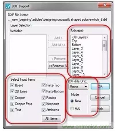 圖 5:PCB 設(shè)計(jì)工具(如這里介紹的 PADS)需要能夠使用 DXF 格式控制所需的各種參數(shù)。