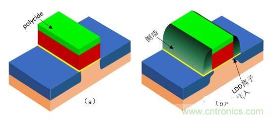 MOS器件的特征尺寸縮小到深亞微米導(dǎo)致的另外一個問題是短溝道效應(yīng)引起的亞閾值漏電流。隨著MOS器件的柵極長度縮小到0.25um,源漏之間的耗盡區(qū)會相互靠近,導(dǎo)致它們之間的勢壘高度降低,形成亞閾值漏電流。雖然MOS器件的柵極長度從0.33um縮小到0.25um時,器件的工作電壓也從3.3V降低到2.5V,但是MOS器件的亞閾值區(qū)的漏電流依然很大。為了降低MOS器件的亞閾值區(qū)的漏電流,需要增加一道溝道離子注入和暈環(huán)(Halo)離子注入增加溝道區(qū)域的離子濃度,從而減小源漏與襯底之間的耗盡區(qū)寬度,改善亞閾值區(qū)的漏電流。如圖1.15(a)所示,進行溝道離子注入的MOS管結(jié)構(gòu)圖。