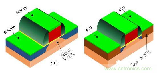 隨著MOS器件的特征尺寸不斷縮小到90nm及以下時,短溝道效應(yīng)中的器件亞閾值電流成為妨礙工藝進一步發(fā)展的主要因素,盡管提高溝道摻雜濃度可以在一定程度上抑制短溝道效應(yīng),然而高摻雜的溝道會增大庫倫散射,使載流子遷移率下降,導(dǎo)致器件的速度降低,所以僅僅依靠縮小MOS器件的幾何尺寸已經(jīng)不能滿足器件性能的提高,需要一些額外的工藝技術(shù)來提高器件的電學(xué)性能,例如應(yīng)變硅技術(shù)。應(yīng)變硅技術(shù)是通過外延生長在源漏區(qū)嵌入應(yīng)變材料使溝道發(fā)生應(yīng)變,從而提高載流子遷移率,最終提高器件的速度。例如NMOS的應(yīng)變材料是SiC,PMOS的應(yīng)變材料是SiGe。另外,隨著源漏的結(jié)深的短減小,源漏擴散區(qū)的厚度已經(jīng)不能滿足形成Salicide的最小厚度要求,必須利用新技術(shù)RSD(Raise Source and Drain)技術(shù)來增加源漏擴散區(qū)的厚度。RSD技術(shù)是通過外延技術(shù)生長在源漏區(qū)嵌入應(yīng)變材料的同時提高源漏擴散區(qū)的厚度。如圖1.15(b)所示,是采用應(yīng)變硅和RSD技術(shù)的MOS管結(jié)構(gòu)圖。