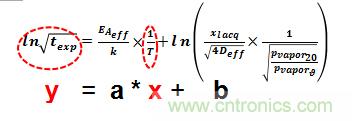這個(gè)一般描述可解釋為直線函數(shù) y = ax + b,其中 y 代表暴露時(shí)間 texp 的 ln√,x 代表 1/T(= 絕對(duì)溫度 T [開爾文] 的倒數(shù)),如圖 3 所示。