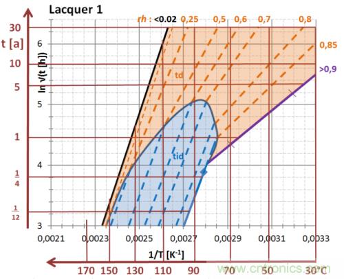 由于標(biāo)準(zhǔn)化的暴露時(shí)間 ln√texp 是溫度倒數(shù) 1/T 的直接函數(shù),所以可用一個(gè)圖表,亦即用 ln√t – 1/T 圖描述和總結(jié)元件在整個(gè)溫度-濕度-時(shí)間域中的性能和健康預(yù)測(cè),以及其系統(tǒng)特征鑒定: