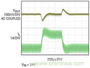 圖 3:LTC3895 在 12V 輸出、2A 階躍負載時的瞬態(tài)響應(yīng)