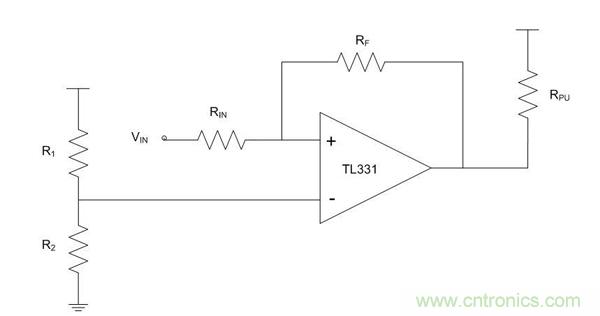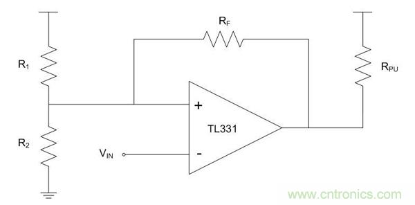 下面的例子所示為安森美半導(dǎo)體TL331配置為一個反相施密特觸發(fā)器。L331是無內(nèi)部滯回的單通道、低功耗、集電極開路的比較器。由R1和R2電阻創(chuàng)建的電阻分壓器在非反相引腳上設(shè)置參考電壓,在比較器輸出開關(guān)處設(shè)置閾值電壓。由于這是一個集電極開路的比較器,所以連接一個上拉電阻到輸出。反饋電阻通過正反饋增加滯回。通常情況下,使用一個比較大的反饋電阻值,至少100 KΩ。