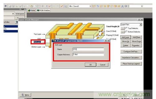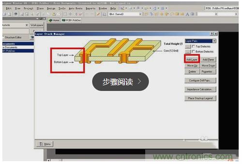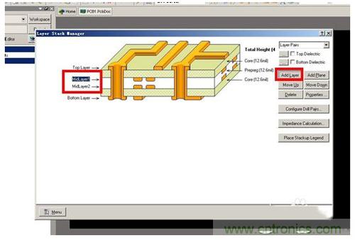 可以看到目前只有兩個(gè)層Top Layer 和 Bottom Layer??梢钥匆娪覀?cè)有Add Layer選項(xiàng)。