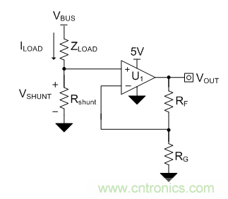 在設(shè)計低側(cè)電流感應(yīng)電路時,高性價比的方法之一是使用非反相配置運算放大器(op amp)。圖1是使用運算放大器的典型低側(cè)電流感應(yīng)電路原理圖。