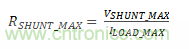 計算最大分流電阻。當(dāng)來自負(fù)載(ILOAD)的電流流過分流電阻器(RSHUNT)時,分流電阻器上會形成一個電壓電位(VSHUNT)。VSHUNT被視為系統(tǒng)負(fù)載的“接地端”。因此,建議將VSHUN的最大負(fù)載電流保持在100mV以下,以避免在與其它具有真正0V接地的系統(tǒng)連接時出現(xiàn)問題。公式2用于計算RSHUNT值: