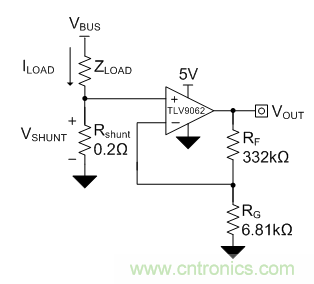 選擇運算放大器。在低側(cè)電流感應(yīng)應(yīng)用中,如果電流是雙向的,共模電壓可以處于或低于地電位;因此,放大器的輸入共模電壓范圍必須處于或低于地電位。TLV9062是一款高性能通用放大器,專為成本敏感型的應(yīng)用而設(shè)計,其輸入共模電壓范圍可低至地電位。